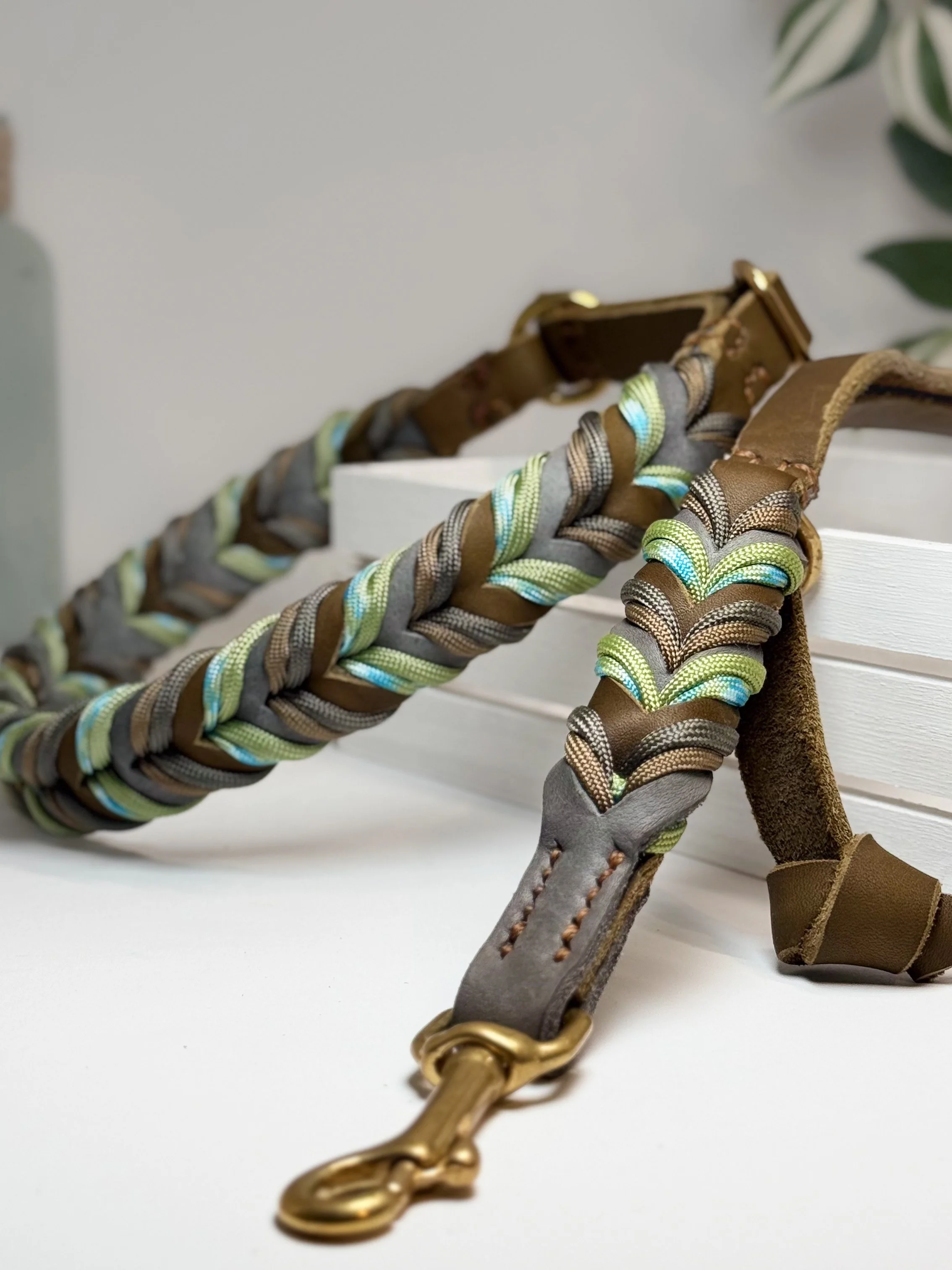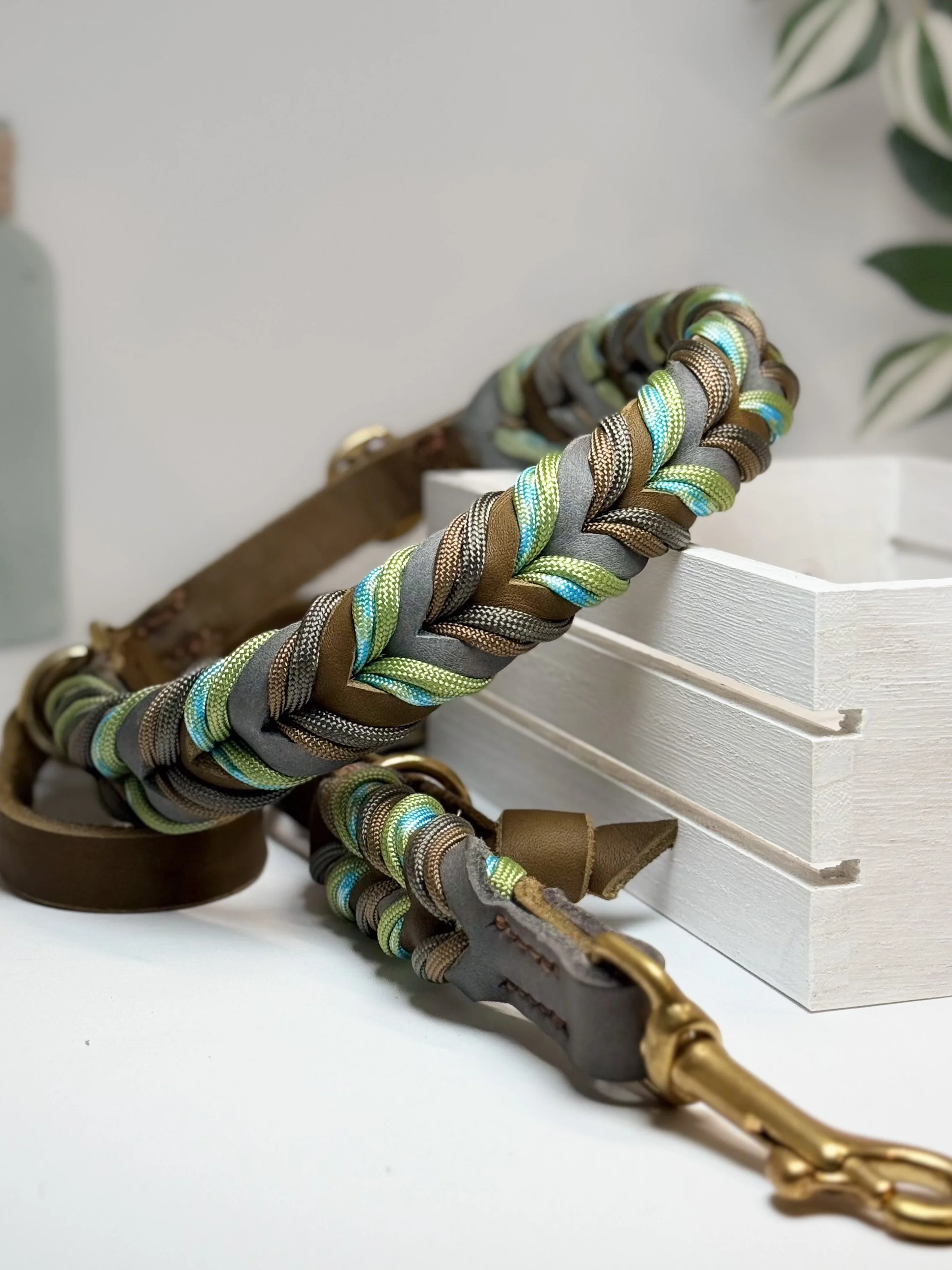Wähle die Farbe des Fettlederriemens selbst – dezent Ton in Ton oder mit kontraststarken Akzenten. So entsteht eine Leine, die nicht nur funktional ist, sondern auch optisch zu deinem Hund und Halsband passt. Die gezeigte Variante ist nur ein Beispiel.